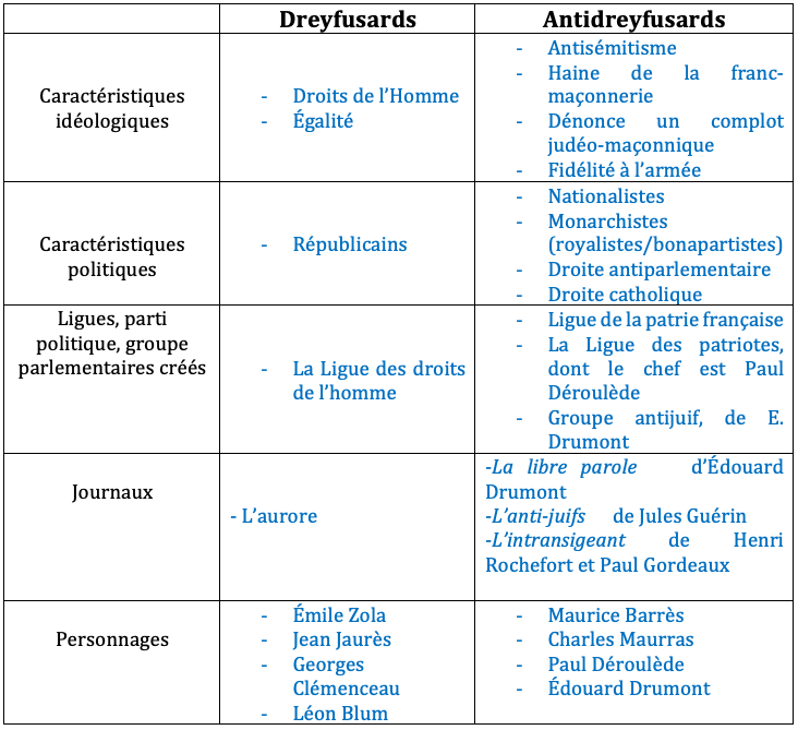 D’un côté les dreyfusards (dont E. Zola, J. Jaurès, G. Clémenceau, L. Blum…) défendent l’innocence de Dreyfus et réclament la révision du procès. Ils prônent une justice impartiale en se revendiquant des droits de l’homme. De l’autre les antidreyfusards, marqués par un nationalisme et un antisémitisme en pleine croissance (comme M. Barrès, E. Drumont, Ch. Maurras, …) l’accusent, et ne veulent pas d’une révision de procès qui pourrait ternir l’image de l’armée déjà mise à mal depuis l’humiliante défaite de 1870.