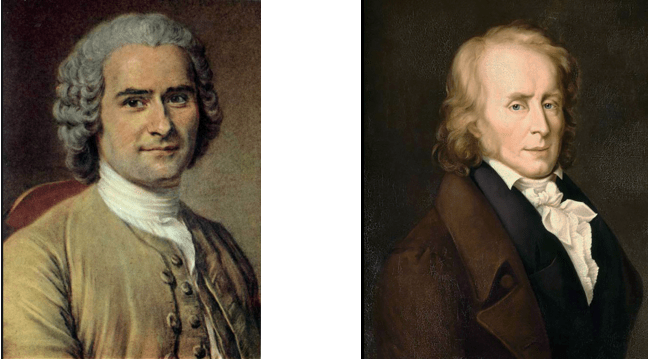 Jean-Jacques Rousseau (1712-1778) est un écrivain, philosophe et penseur de la démocratie pris comme référence. En 1762, il publie Du Contrat Social, dans lequel il énonce son idéal républicain, et une critique du système représentatif dans le Livre III. Il se montre favorable à la séparation des pouvoirs, puisqu’il qualifie de « dangereux » le fait que celui qui fasse la loi l’exécute.