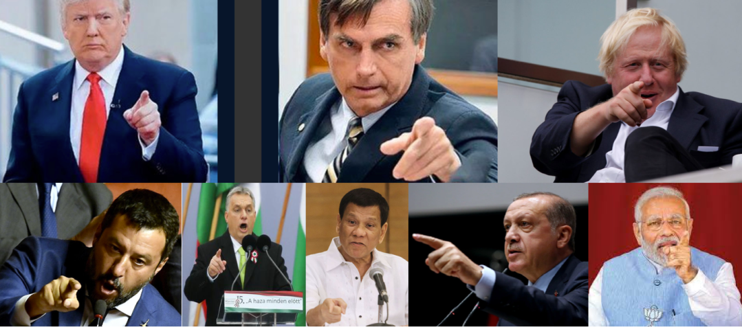 Leaders « populistes »: Donald Trump (Etats-Unis), Jaïr Bolsonaro (Brésil), Boris Johnson (Royaume Uni), Matteo Salvini (Italie), Viktor Orbán (Hongrie), Rodrigo Duterte (Philippines), Receep Tayyip Erdogan (Turquie), Narendra Modi (Inde), …