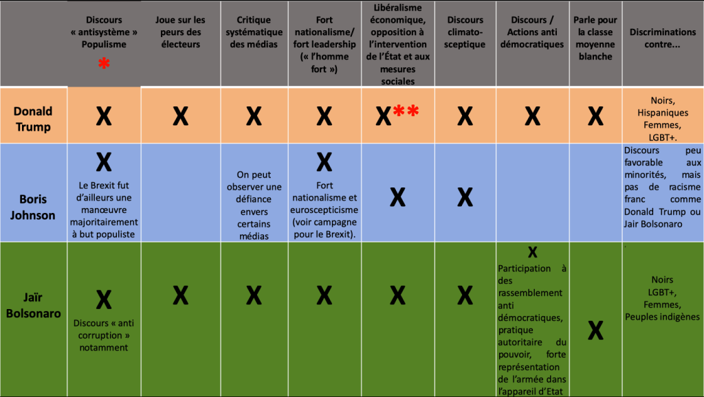 Nous avons tenté de dresser une comparaison entre Donald Trump et deux autres dirigeants politiques dits « populistes » arrivés au pouvoir en 2019. En retenant quelques caractéristiques récurrentes de leurs discours (dont la liste ne saurait être exhaustive), nous avons voulu cerner certains points de convergence entre leurs politiques.