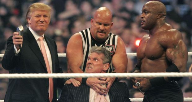 Enfin, le comportement et l’attitude de Trump peuvent même être comparés à un catcheur ayant le « mauvais rôle » dans un duel. Grossier, franc et brutal, Jess Ventura est un ancien catcheur et ami de Trump, il se fait lui aussi remarquer au début de sa carrière en participant à des émissions de télévision ou des publicités, et communique en grande partie grâce aux médias populaires. La façon de gouverner de Trump est, on l’a vu, prise comme exemple par certains gouverneurs d’extrême droite, elle fait mouche comme un catcheur sur un ring: Durant sa campagne victorieuse, le candidat Trump assénait: “Quand quelqu’un vous attaque, ripostez. Soyez Brutal, soyez féroce”.